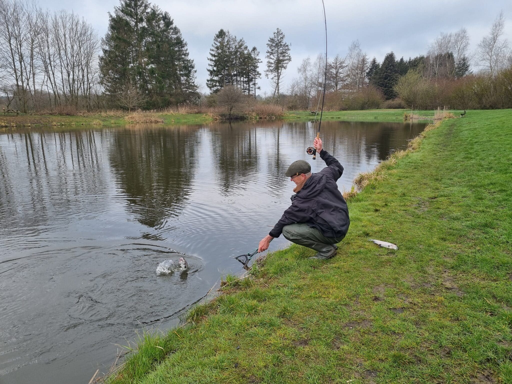Det gjorde det ikke helt nemt f.eks. med net at fange de 2 store regnbuer på over 6 kilo oppe i karet, som var en del af dagens udsætning. Det lykkedes – dog med den ene sammen med mindre men ikke små fisk.
