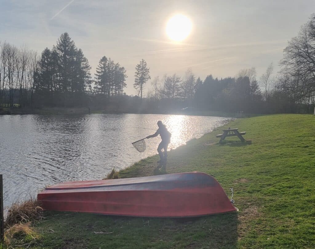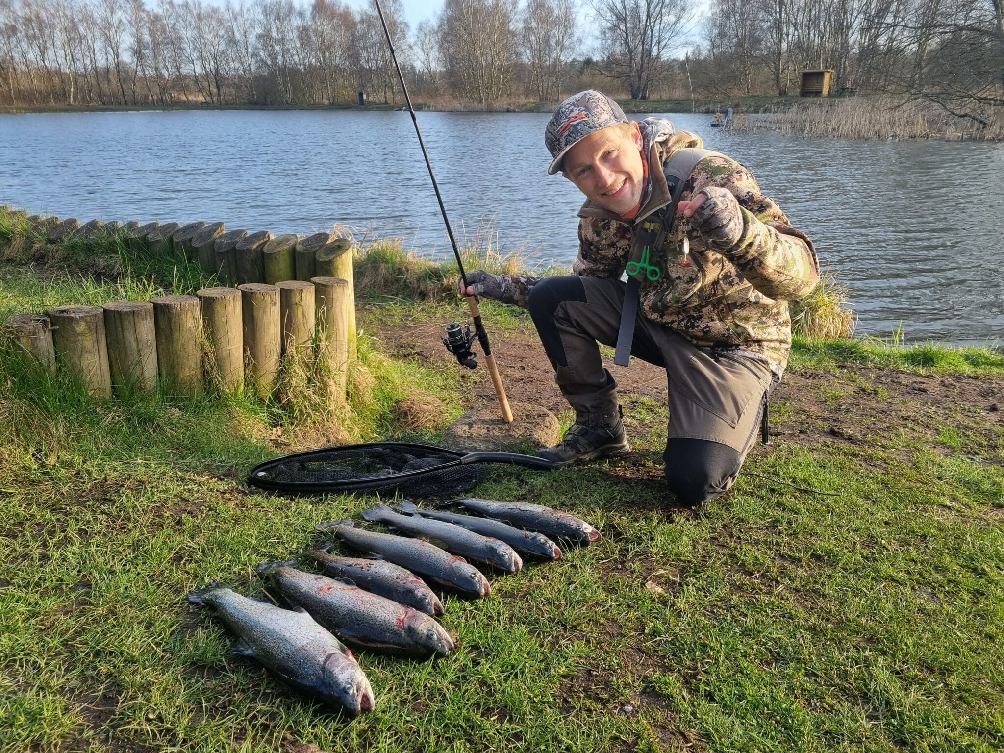 Alt blev taget på en “Blue Fox” spinner. Han havde kontakt med mange flere, som ikke nåede med ind til kanten. For der var liv i dem med udløb og spring op af vandet, når de var kroget. Det var en ret sjov dag, kunne vi forstå på Rasmus.![]()