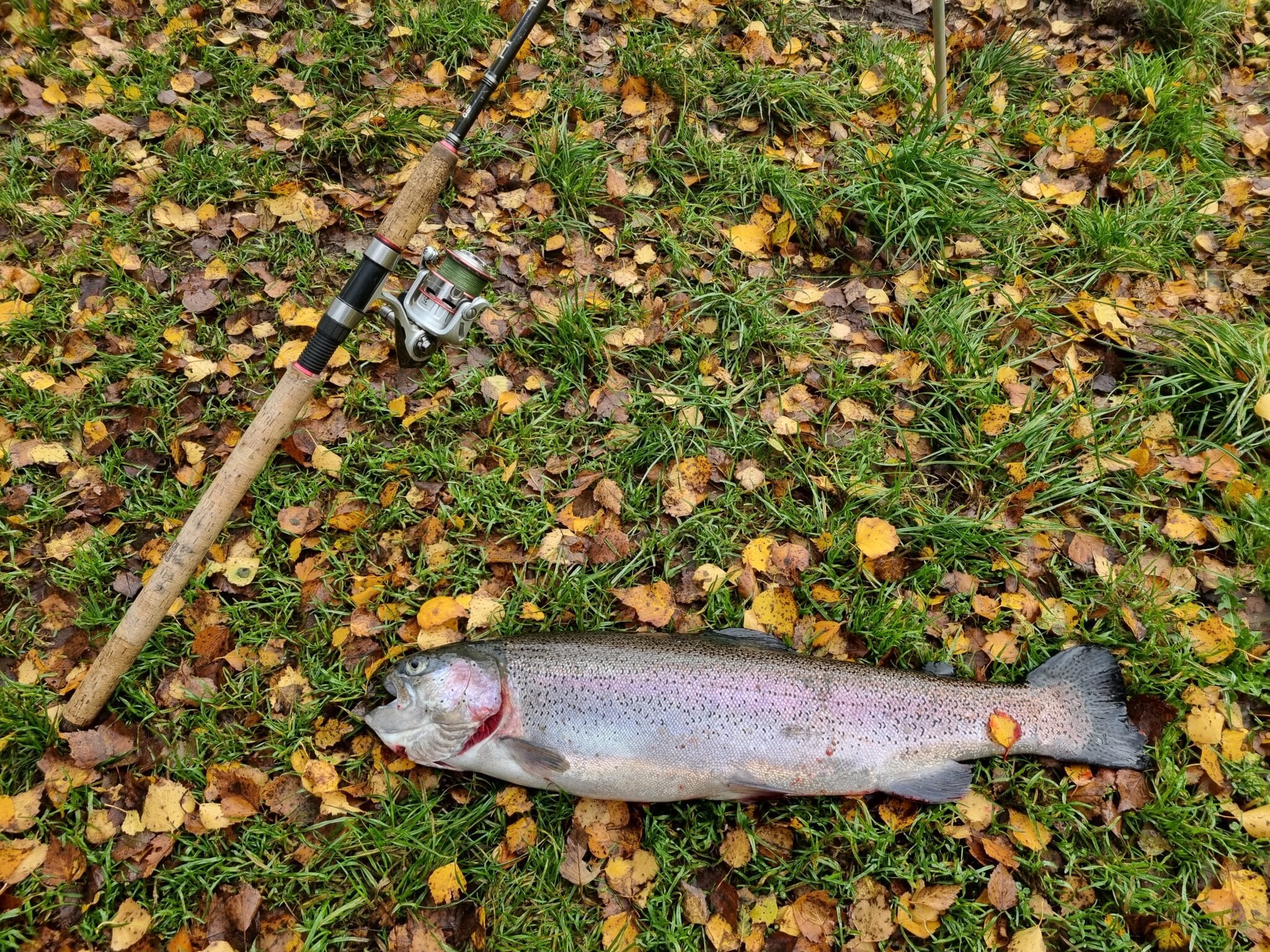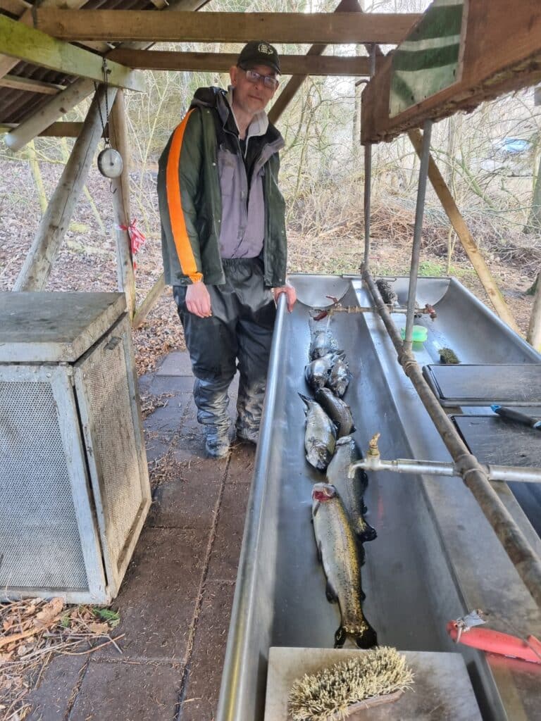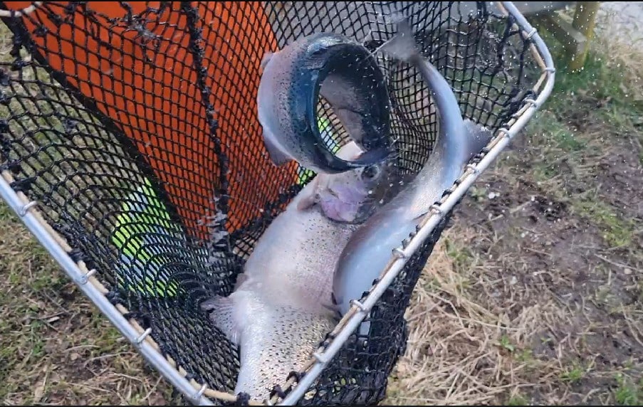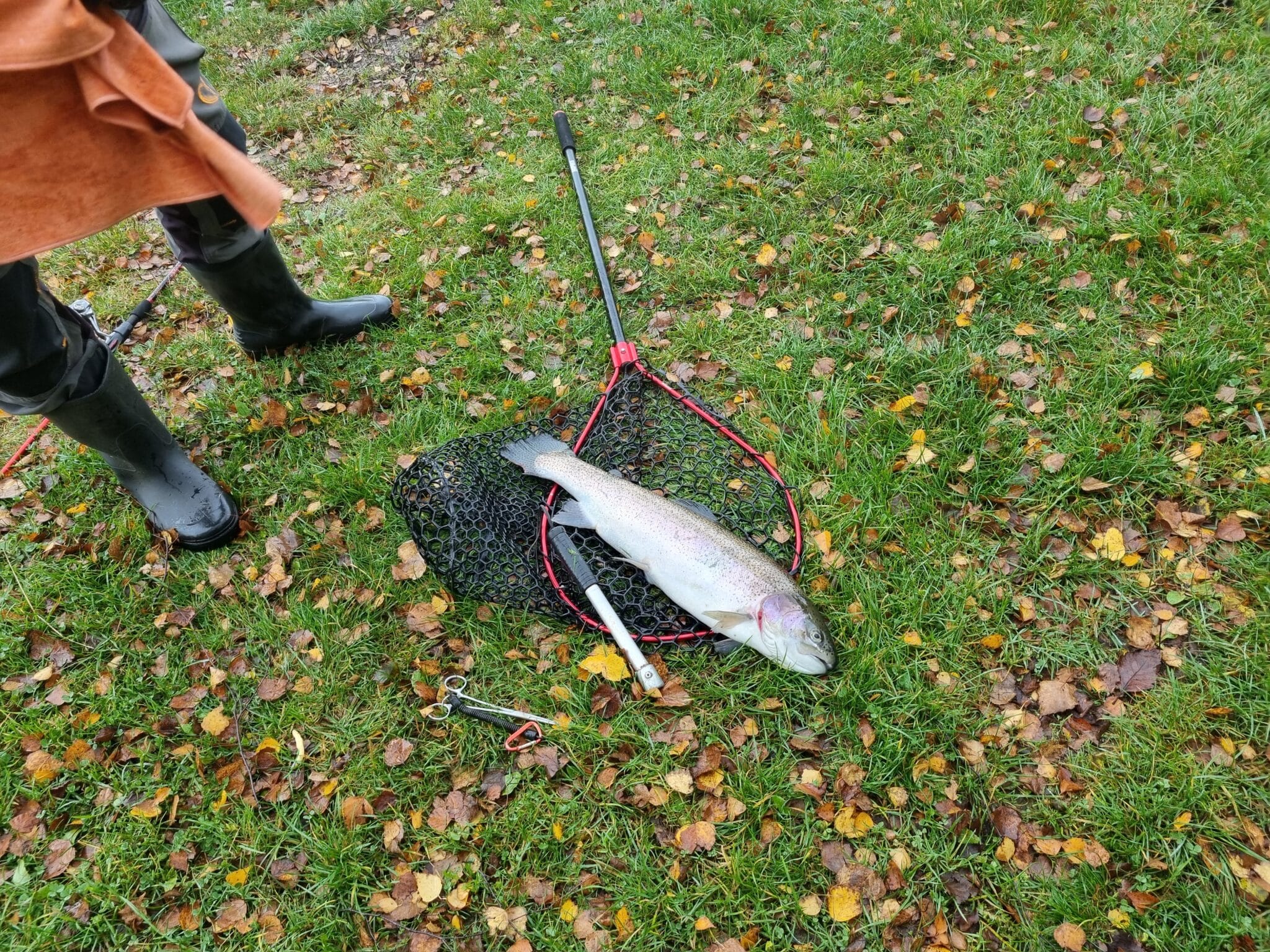 Det gjorde det ikke helt nemt f.eks. med net at fange de 2 store regnbuer på over 6 kilo oppe i karet, som var en del af dagens udsætning. Det lykkedes – dog med den ene sammen med mindre men ikke små fisk.