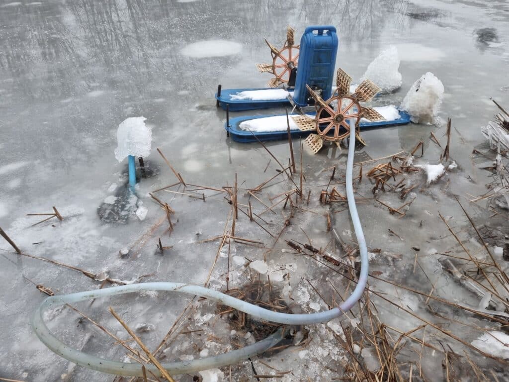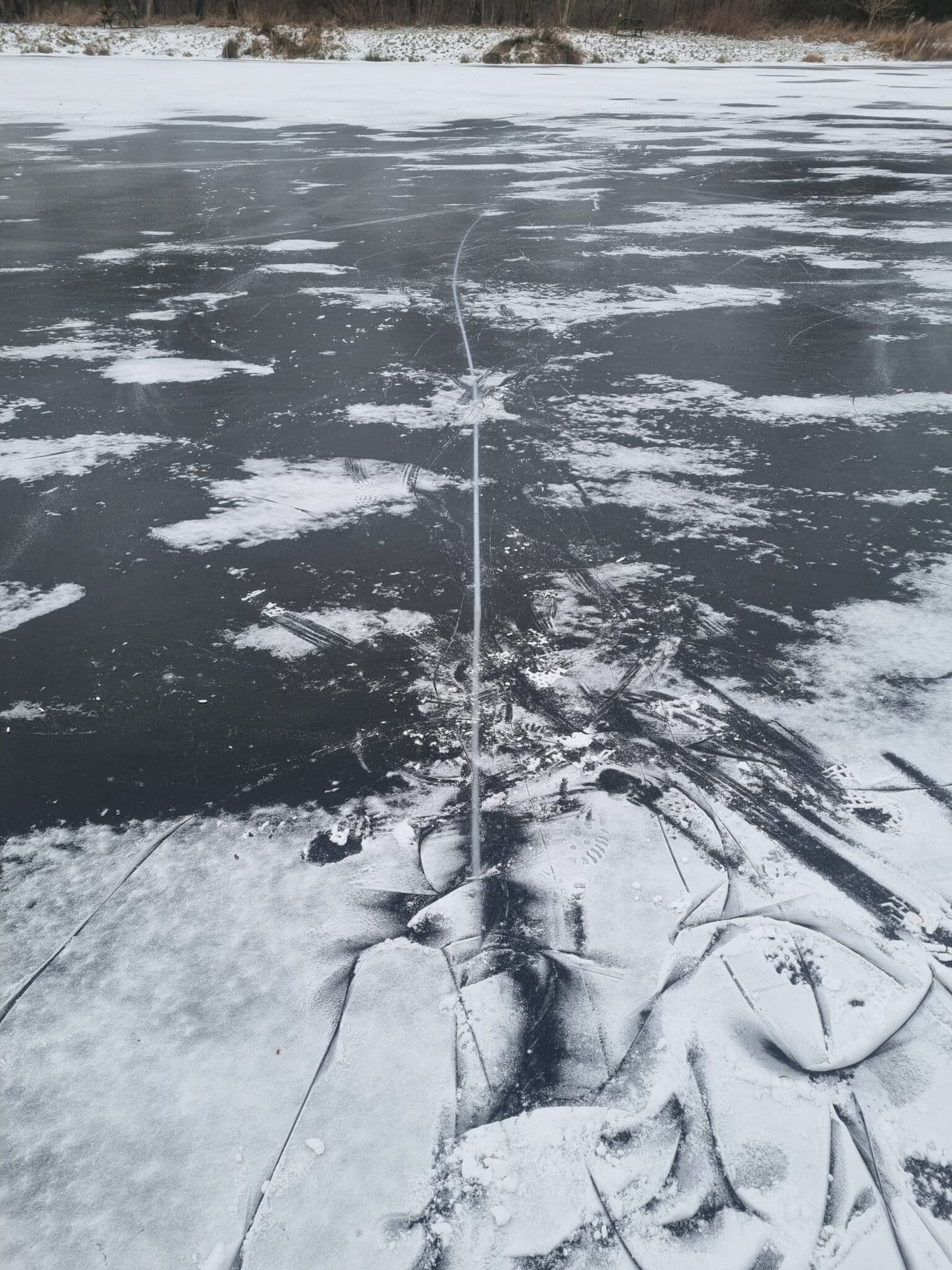 Piskeren har som forventet fået lavet en våge, som også når et stykke ud forbi området ved piskeren. MEN pga. af siv (ja, de burde være fjernet 😝) og at piskeren måske ikke “peger” helt rigtigt, ser det ud til, den ikke får arbejdet med isen kanten rundt. Derfor er der stadig tyk is en meter eller mere ud til vågen, hvilket er skidt.