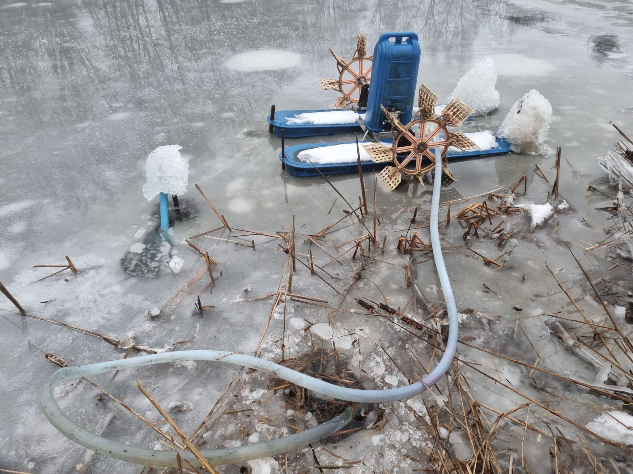 Vi fik piskeren i gang her til morgen. Den sender nu vand ud over og ind under isen, hvilket har sin virkning.😀