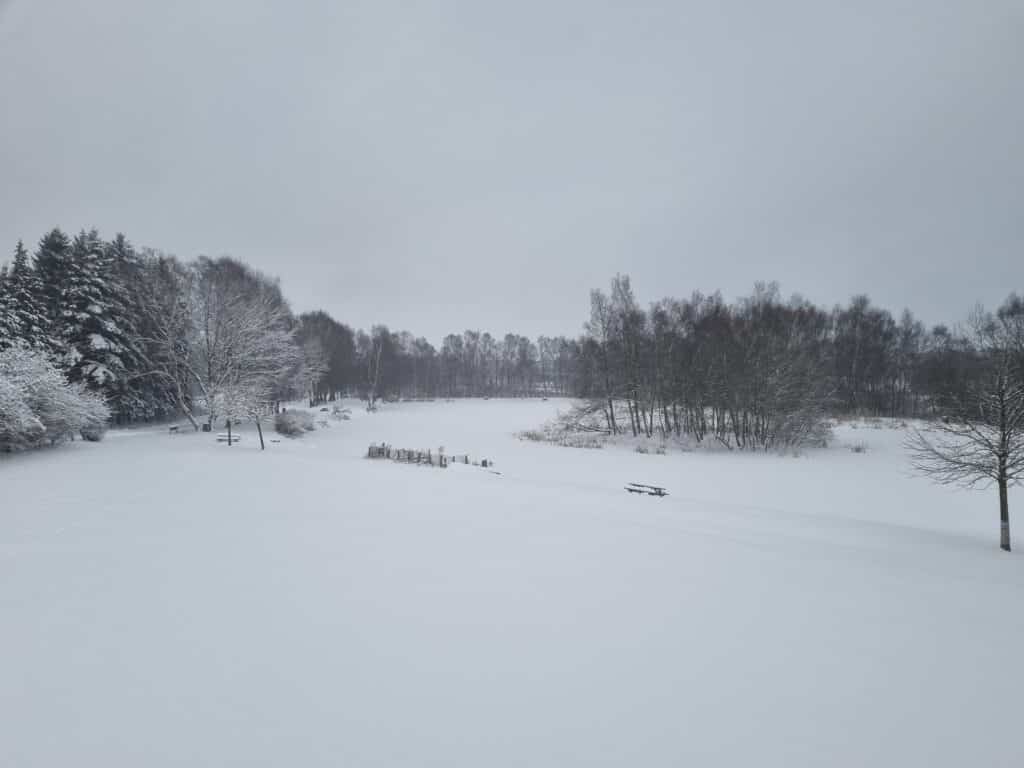 Her til morgen er vi sneet inde. Vadym kontaktede os og fortalte han måtte gå ned ad markvejen til os, da man ikke kan køre ned til søen. 😣