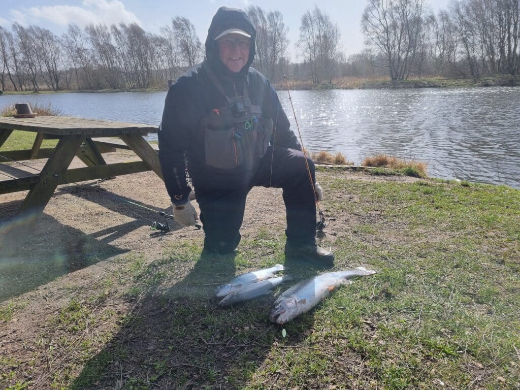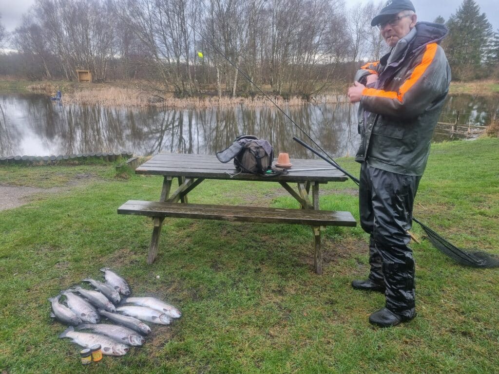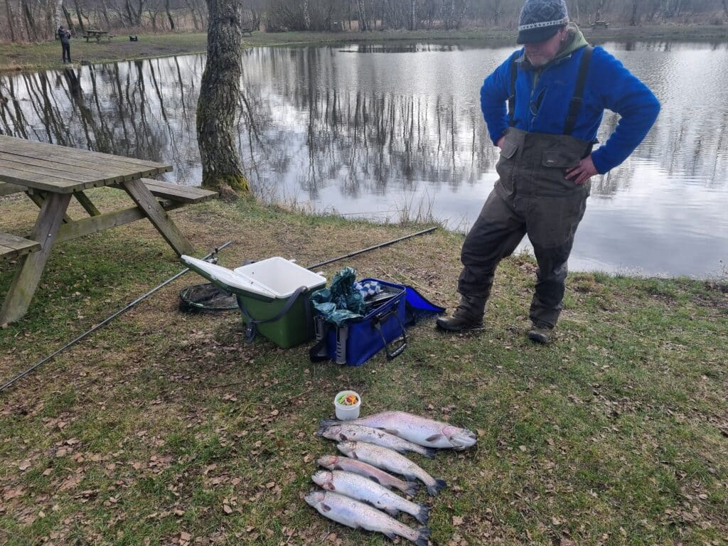 Han købte det store fiskekort, men allerede efter små 4 timer kunne han melde “fyldt kort”. Det hele taget på powerbait fisket aktivt rundt omkring i søen. 👍